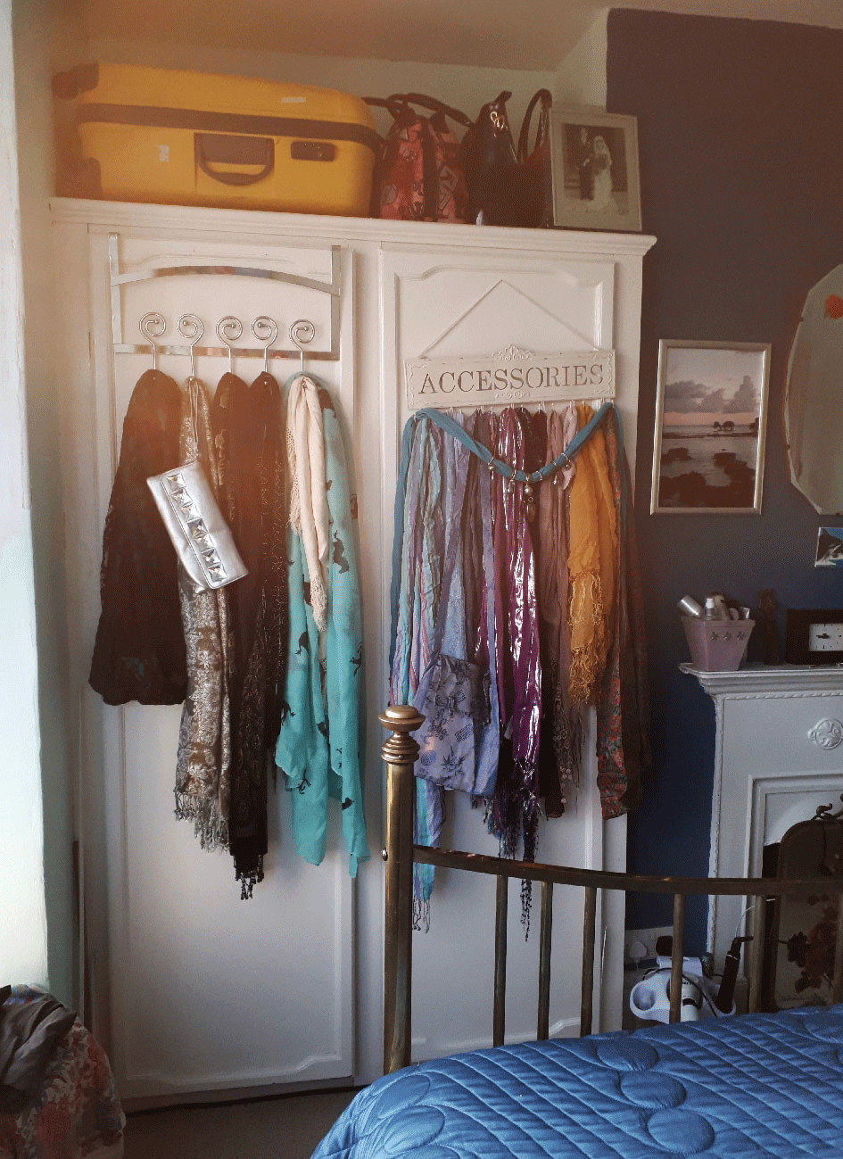 To finish off we looked through the shoes and accessories. We put larger handbags on top of the main wardrobe and rotated the yellow suitcase so it’s flush with the edge. Everything is easy to reach, contained and neat. The scarves were there already but we found a few stray ones and arranged by colour in a pleasing display.