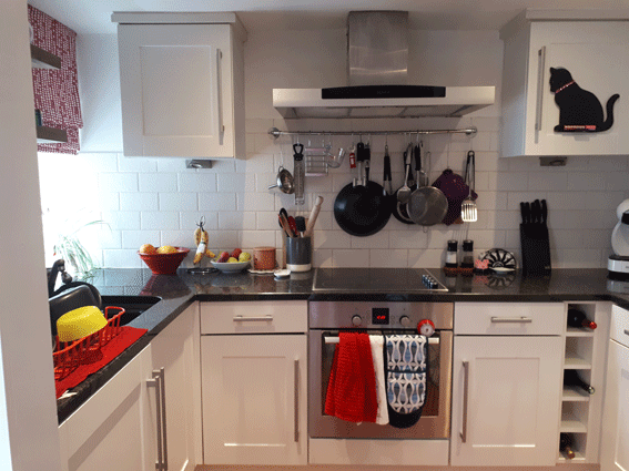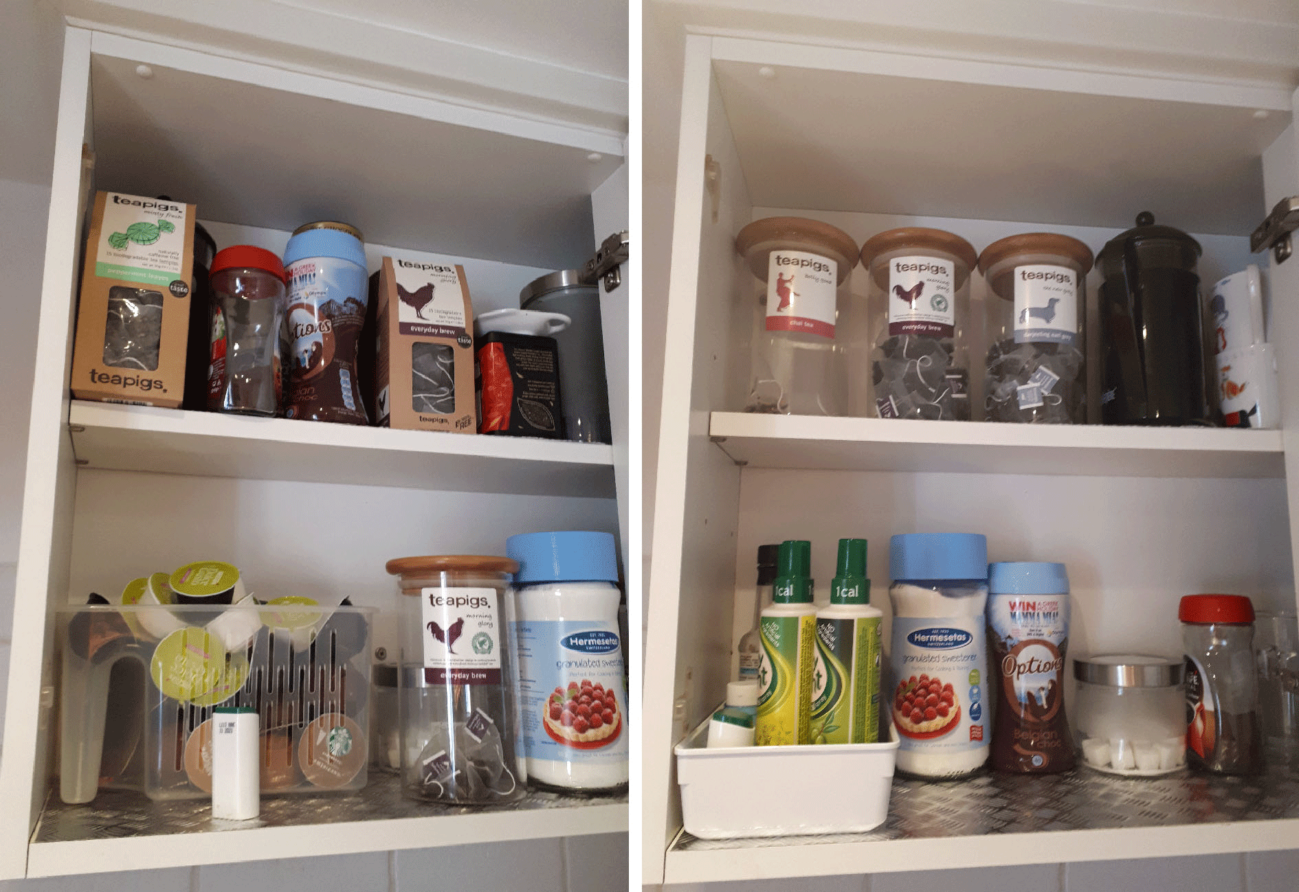 This cupboard was deceptive, there were bits and pieces hidden round the corner, some of it useful and forgotten about! We emptied it and used some jars we came across to store the tea. Oils are now kept near the hob so it’s easy to reach when cooking.