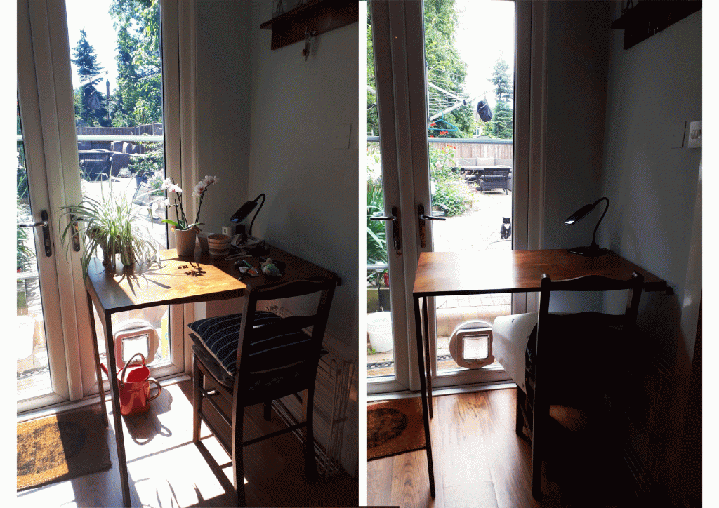 Due to the re-organisation of the kitchen, this table was cleared completely, leaving a great place to sit and eat or write, and when it’s not in use it’s folded away onto the wall, where it’s used as a handy picture frame.